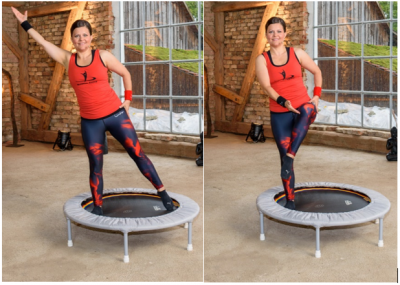 Übungsablauf: Im Walkingschritt die Beine zum Trampolinmattenrand öffnen. Gewicht auf einer Seite lassen, das andere Bein abwechselnd seitlich auf der Matte tippen und das Knie auf Hüfthöhe anheben. 4 Wiederholungen, dann die Seite wechseln. Achtet dabei auf Körperhaltung und Bauchspannung.